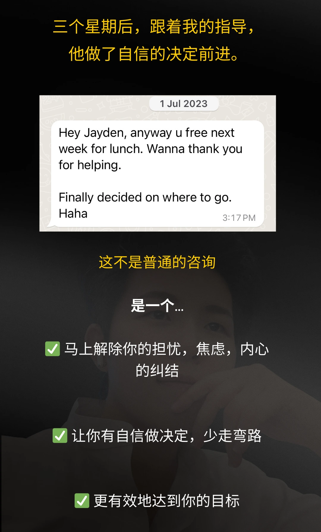 DISCLAIMER: All income and success examples are based on my experience and the experiences of my clients. They are not guarantees. Your outcomes vary, depending on your background, commitment, skills, and actions. You may achieve less, the same, or more than the examples provided. These examples are provided to show what is possible, not to guarantee any specific outcome.